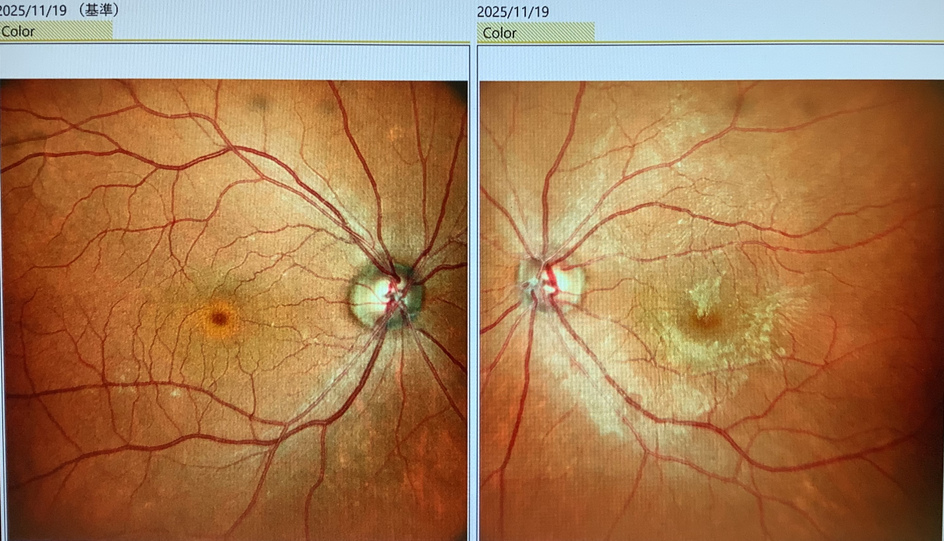 今日、黄斑上膜の硝子体手術の申し込みをいただいた 歳代の女性の方は、 頃から黄斑上膜を認めていました。黄斑上膜の手術は視力が下がった時が時期になることが多いですが、この方の場合、視力はまだ1.2は出ていたものの、ご本人の歪みの症状が強くなってきたため、手術の方針とさせていただきました。黄斑上膜は黄斑の上に異常な膜が張って黄斑の形が悪くなってしまい、歪んで見えにくさが出てしまう病気ですが、黄斑上膜の手術は“硝子体手術”で(硝子体を取った後に)黄斑上膜を取り除く手術になります。黄斑の形が悪くなって見えにくくなっているのに、黄斑の形がよくなるかどうかは、膜を剥がした結果次第となってしまいます。黄斑上膜があっても、黄斑の形状が正常であれば放っておいても構わないですが、黄斑上膜が黄斑を変形させているならば、その力が強いほど、その影響が長いほど黄斑の変形が治りにくくなります。なので、視力が良好であっても症状が出ていて黄斑の形状が悪くなってしまっている場合は手術をした方がよいかと考えています。今日の患者さんも視力は1.2でしたが黄斑は窪みがなくなって平らになってしまい歪みの症状が強くなっていましたし、年齢も若く、今、手術をしないとしても、いずれどこかの時点で手術が必要となる可能性が高く、進行してから手術をして黄斑にダメージを残してしまうよりは、なるべく悪い影響が出ないうちに手術をした方が得策かと思い、手術の方向で予定させていただきました。もちろん、手術は100%ということはないので、合併症のリスクはありますが、いずれ手術をするのであれば、そのリスクはどの時点でも覚悟しないといけないことなので、あまり考え過ぎる必要はないかとは思います。でも、合併症が起これば、手術しなければよかったと思ってしまうことはどうしてもあるかと思うので、少しでもそう思わないで済むような手術をしたいと思います。