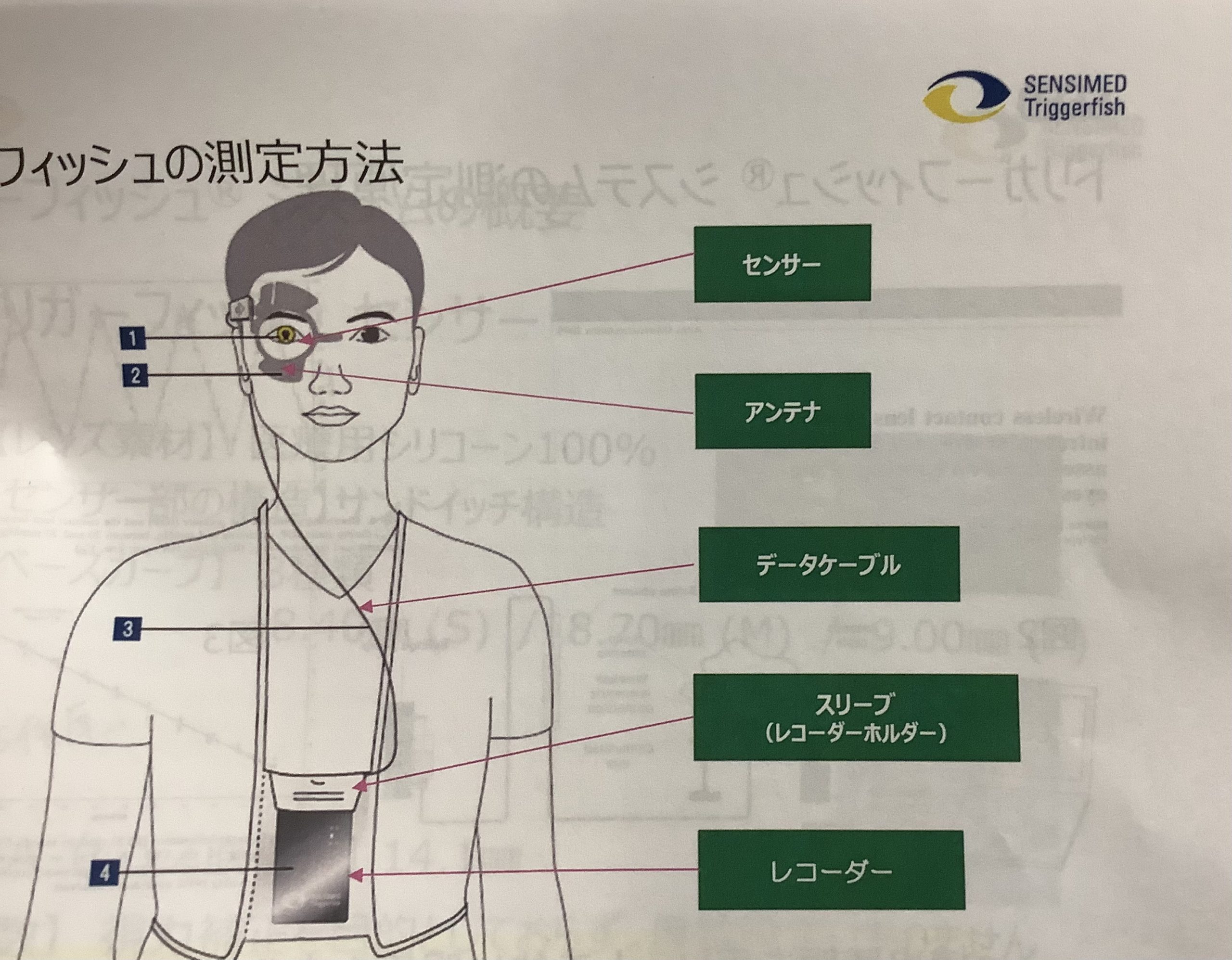 方法としては、コンタクトレンズ型センサーを装用し、目の周りにアンテナを貼ります。データケーブルを通し、レコーダーホルダーに記録が保存されます。