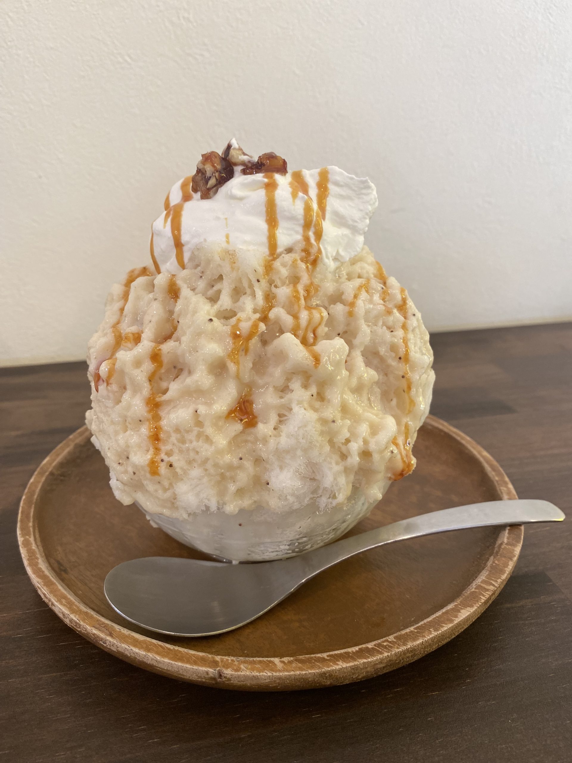 夏の思い出 event_note2025.09.18 9月になり朝と夜は少しずつ過ごしやすくなってきましたね。皆さまいかがお過ごしでしょうか。 この夏は、いくつかのかき氷を楽しみました。マンゴー、もも、キャラメルバナナ、チョコミルク、ブルーベリーミルク、伊予柑ミルクの6種類です。暑い日に食べるかき氷は格別でした。写真はキャラメルバナナです。 来年はまた新しい味にも挑戦してみたいと思います。 秋に向けて気温の変化が大きくなる時期ですので、どうぞお体に気をつけてお過ごしください。