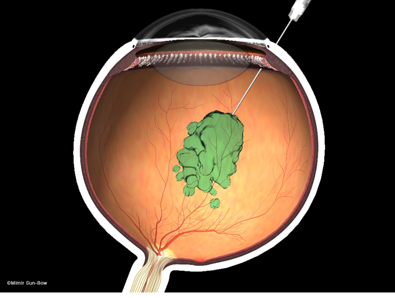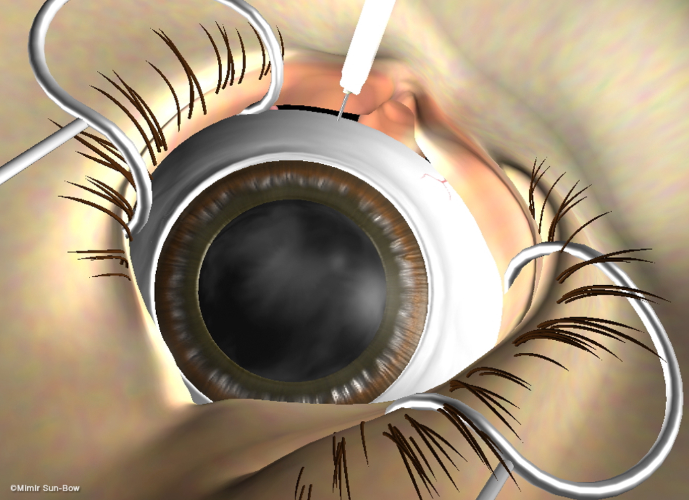 眼に注射というと確かに恐怖心や不安感があると思いますが、点眼で眼の表面を麻酔し、角膜の縁3〜4mmの位置から細い針で薬剤を眼の中に注入し、数分で痛みもほとんどなく終わります。眼の周りの消毒の準備などを入れても10分くらいで処置は完了です。